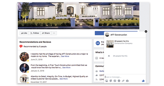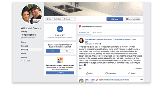 Whitecrest Custom Home Renovations uses a business Facebook page to showcase their 5-star rating for home renovation services. For customers looking for similar services in their area, finding a brand with a 5-star rating and glowing reviews helps narrow down the options in the decision-making process. After completing a project for a client, make an effort to send a nice note requesting their review. Not only will this benefit your brand, but giving the client a chance to reflect on their positive experience will strengthen their ties to you, too!