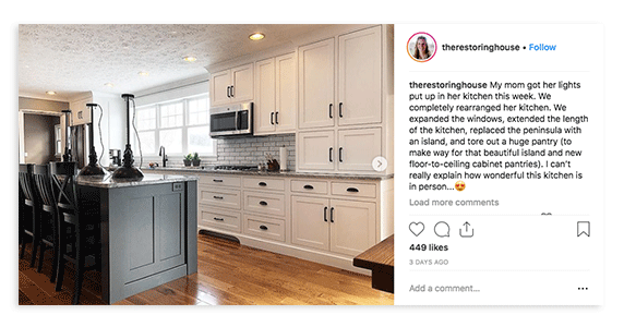 The Restoring House page on Instagram follows the journey of a family with a home renovation business as they purchase and flip houses. By sharing inspiring before and after images, the page has grown to more than 4,000 followers who frequently comment and like each image posted. Choosing to take a simple before and after picture of your project can lead to an endless stream of content and an online community that relies on your posts for their daily inspiration!
